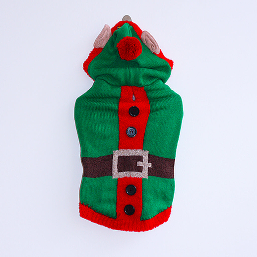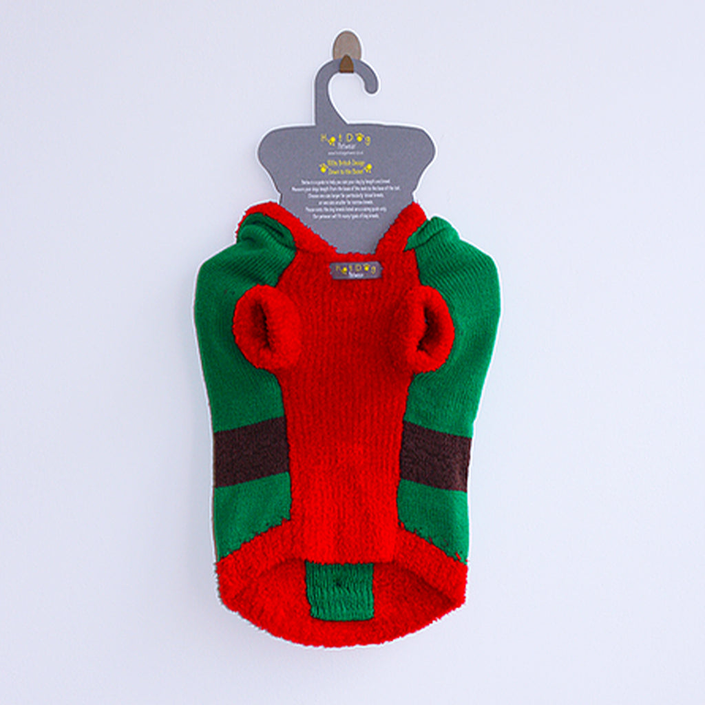 It's time to get festive! Novelty Elf dress up dog jumper with hood, 3D ears and buttons