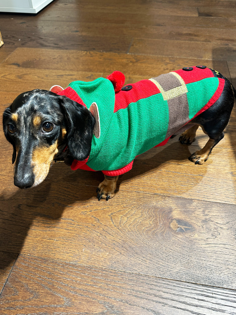 Santas little helper! Elf dress up knitted Miniature Dachshund jumper that is machine washable. A fun festive xmas gift for all of the family to enjoy.